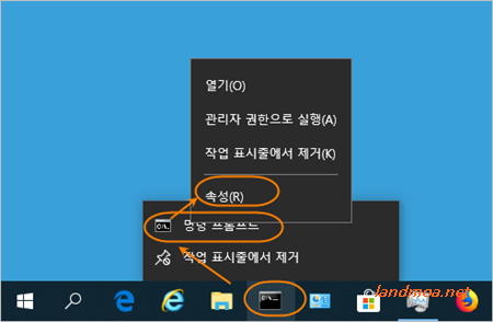여기서는 윈도우즈의 [명령프로프트]를 실행시마다 관리자 권한으로 실행되게 하는 방법을 예시로 알아봅니다. 여기서는 작업표시줄에 있는 경우이지만 바탕화면에 싰능 떄는 우클릭하면 바로 [속성]항목이 보입니다.[속성]을 선택합니다.