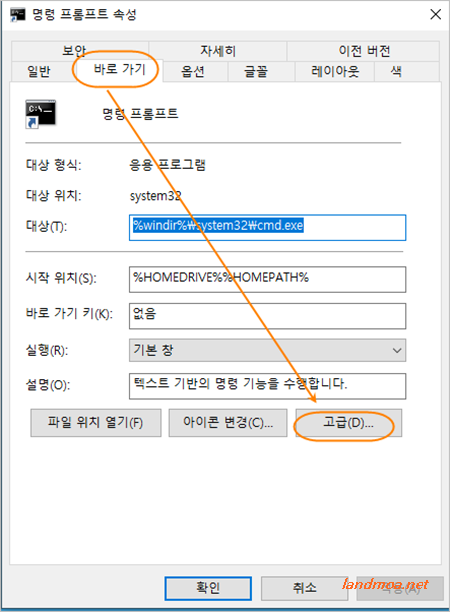 속성창이 열리면 상탄탭 [바로가기]에서 [고급]을 선택합니다.