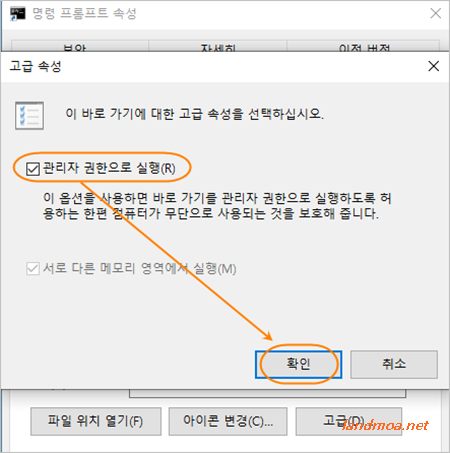 이 부분에서 [관리자 권한으로 실행]에 채크를 해주고 확인을 클릭하시면 됩니다.
