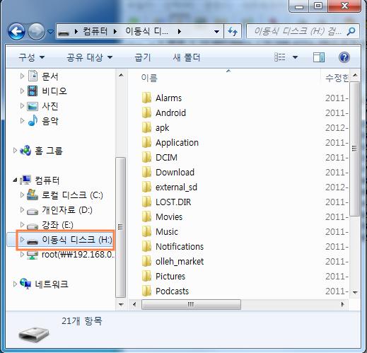 위 그림은 컴퓨터에서 휴대폰이 이동식디스크 (H:)로 인식되었음을 보여주는 화면입니다.