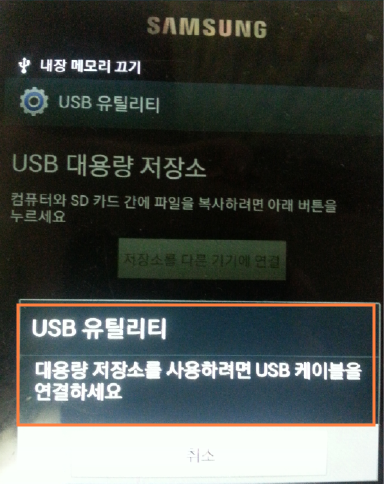 아래의 [대용량 저장소를 사용하려면 USB 케이블을 연결하세요] 메세지가 나왔을 때 휴대폰과 컴퓨터의 USB 케이블을 연결해야 합니다.
