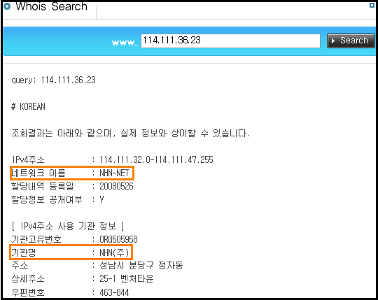 국내 : http://ipwhois.nic.or.kr/ 국제 : https://ws.arin.net/whois 얼마전 일입니다. 어떤 아이피 하나가 20 - 30 개의 세션으로 사이트의 각 메뉴나 세부자료를 30초 단위로 열고 다녔습니다. 순간 해커? 하는 의심이 들어 방문기록을 살펴보아도 특별히 의심할 만한 자료는 없었지요. 이럴때 그 아이피의 소유가 어디인지를 알면 궁금증이나 의심이 해소될 것입니다. 그때의 아이피는 114.111.36.23 이었습니다. 그래서 위 http://ipwhois.nic.or.kr/ 로 검색을 했지요. NHN(주) 에서 사용하는 인터넷 주소인 것까지는 확인이 되었지만 NHN(주)가 뭐하는 곳인지 몰라 포털에서 검색해 봤지요. ========== 검색결과 ====== NHN은..